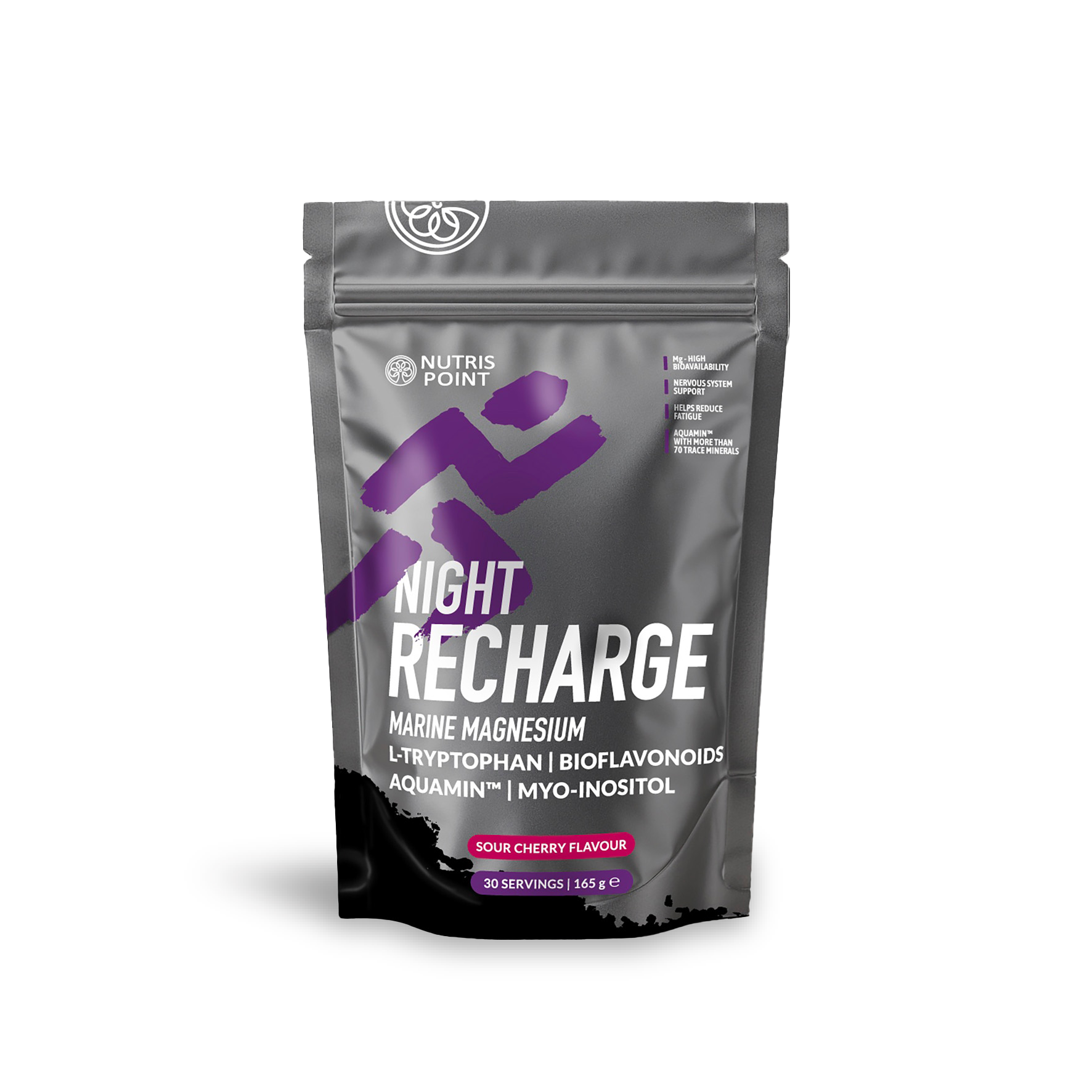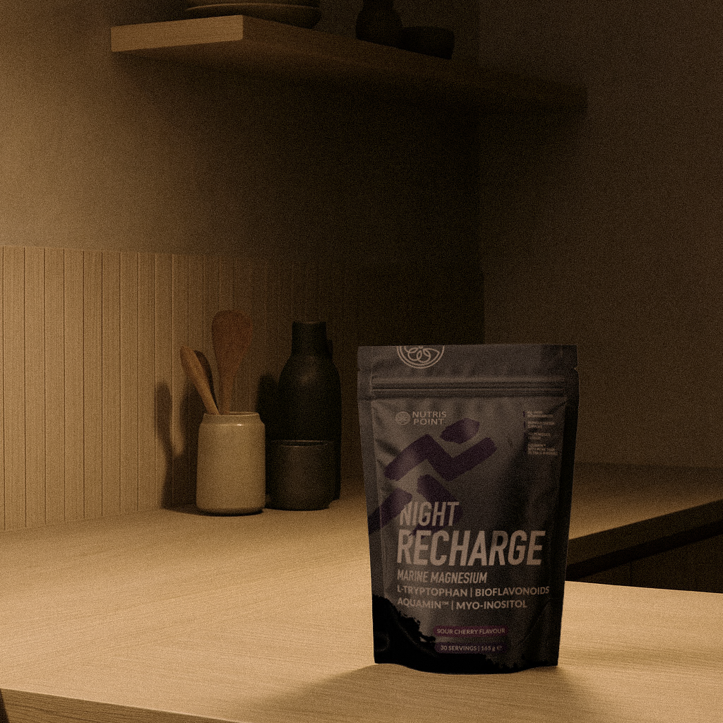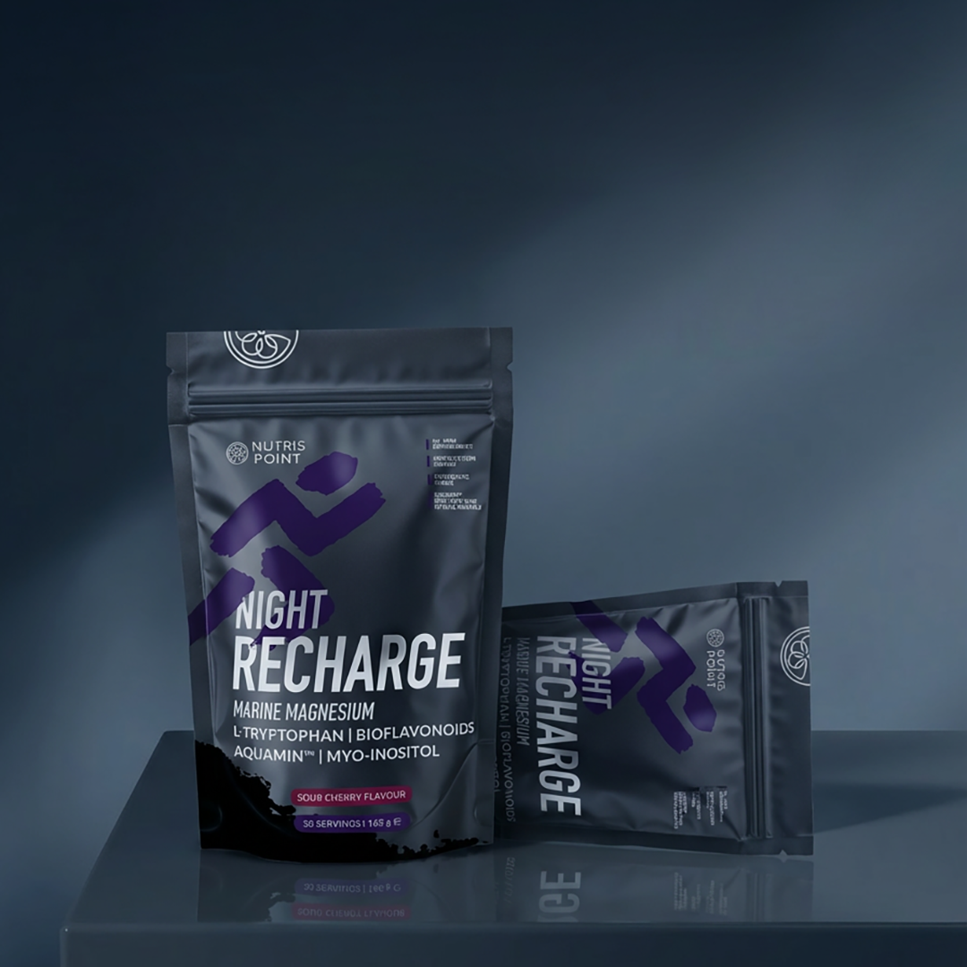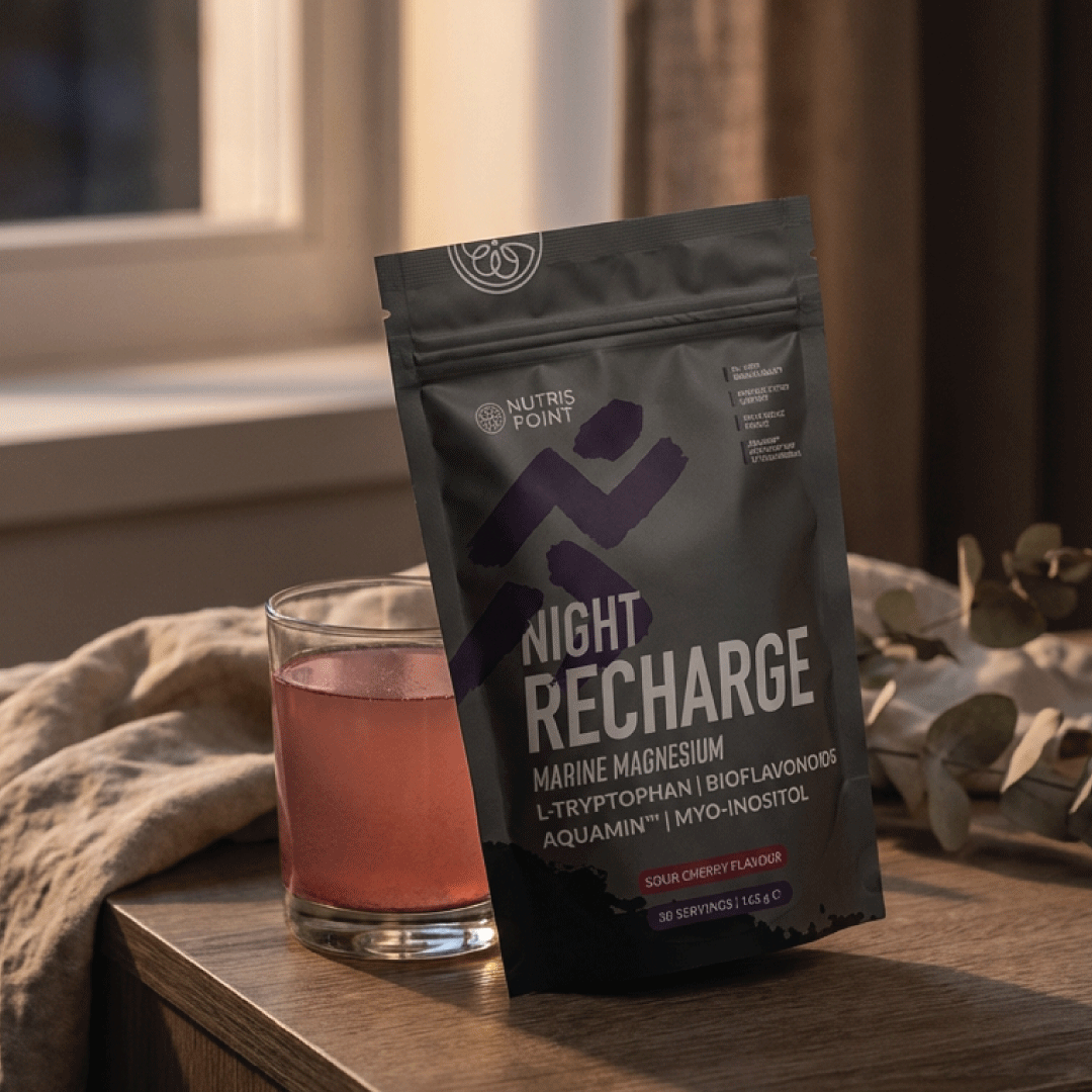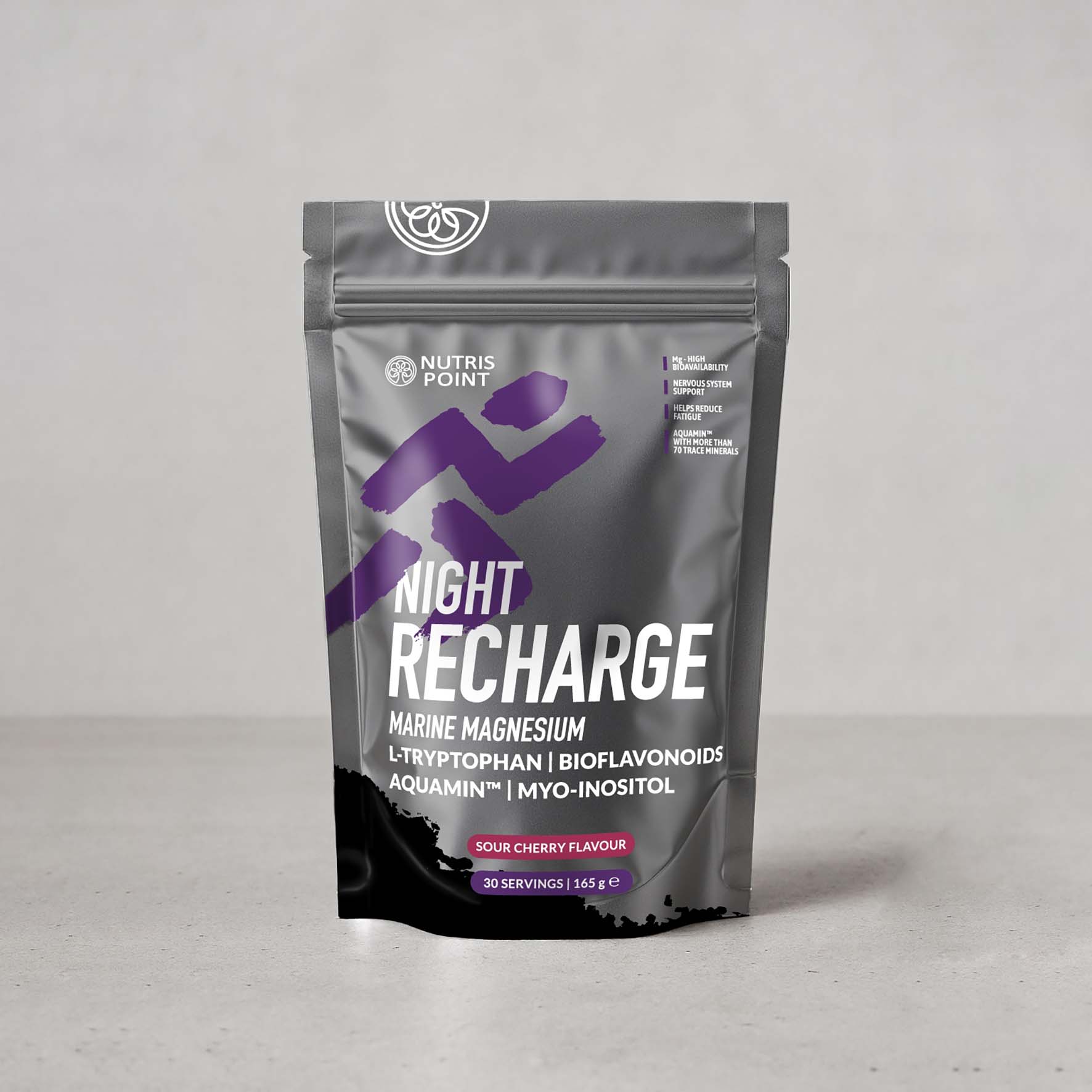 NIGHT RECHARGE je regeneracijski magnezijev napitek v prahu, zasnovan za večerno podporo telesu. Vsebuje naravni Aquamin™ z več kot 70 minerali v sledovih, ki zagotavlja visoko biološko razpoložljivost magnezija. Magnezij prispeva k normalnemu delovanju mišic in živčnega sistema ter pomaga zmanjševati utrujenost in izčrpanost, medtem ko vitamin B6 podpira normalno delovanje živčnega sistema in energijski metabolizem. Napitek je obogaten z L-triptofanom, mio-inozitolom in bioflavonoidi za podporo sprostitvi in regeneraciji, sladkan s stevijo in sukralozo, z osvežujočim okusom višnje.
